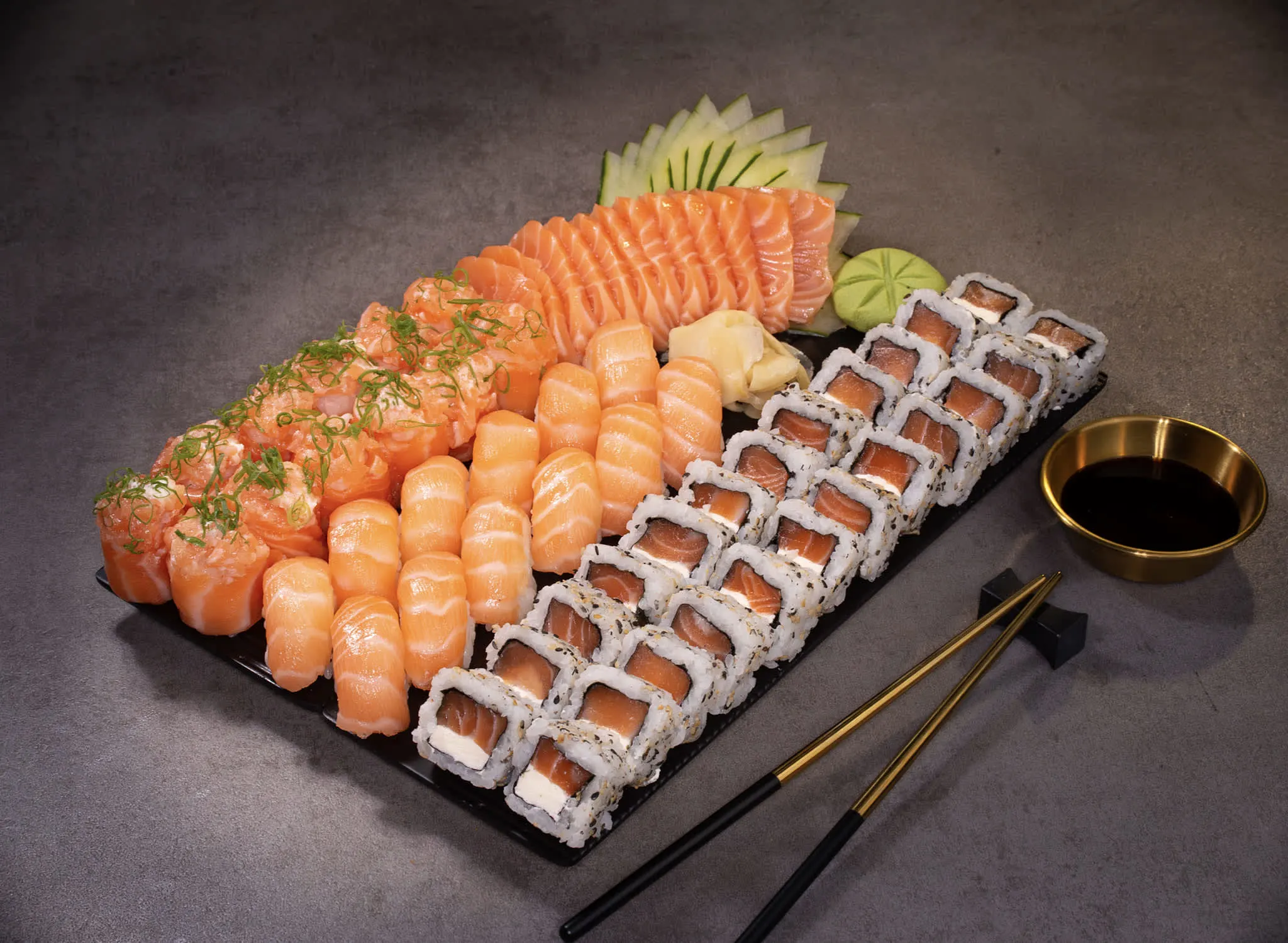12 sashimi salmão, 12 joy salmão, 12 niguiri salmão, 24 uramaki salmão Philadelphia.